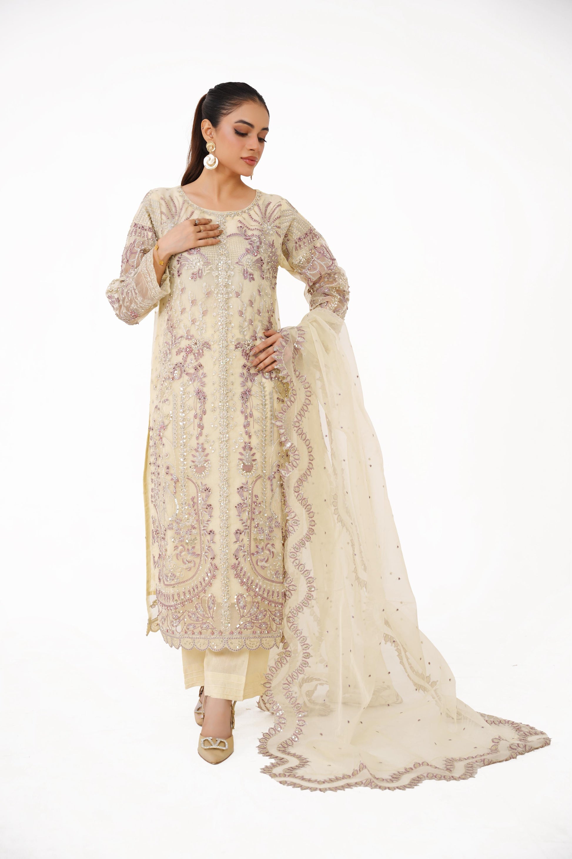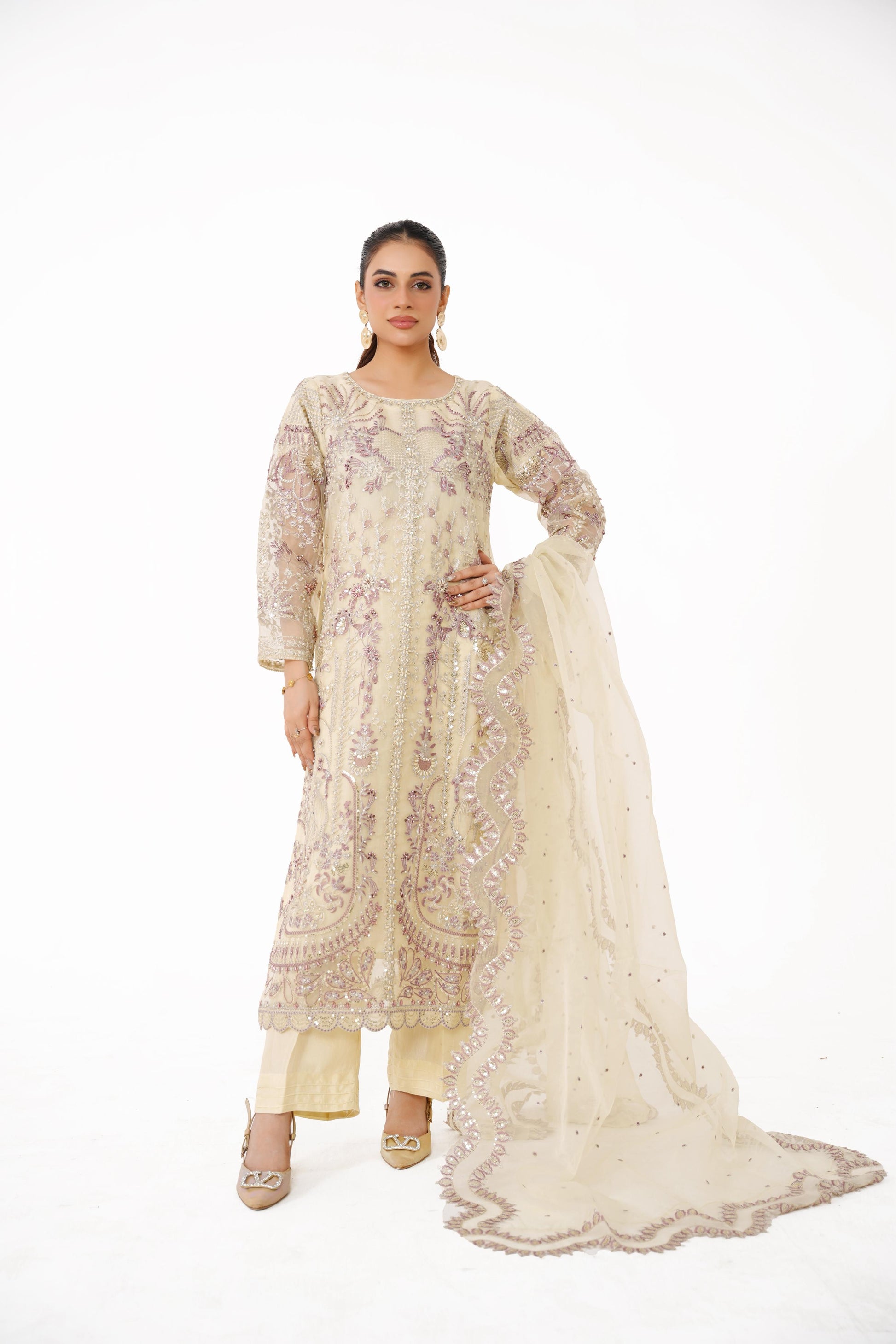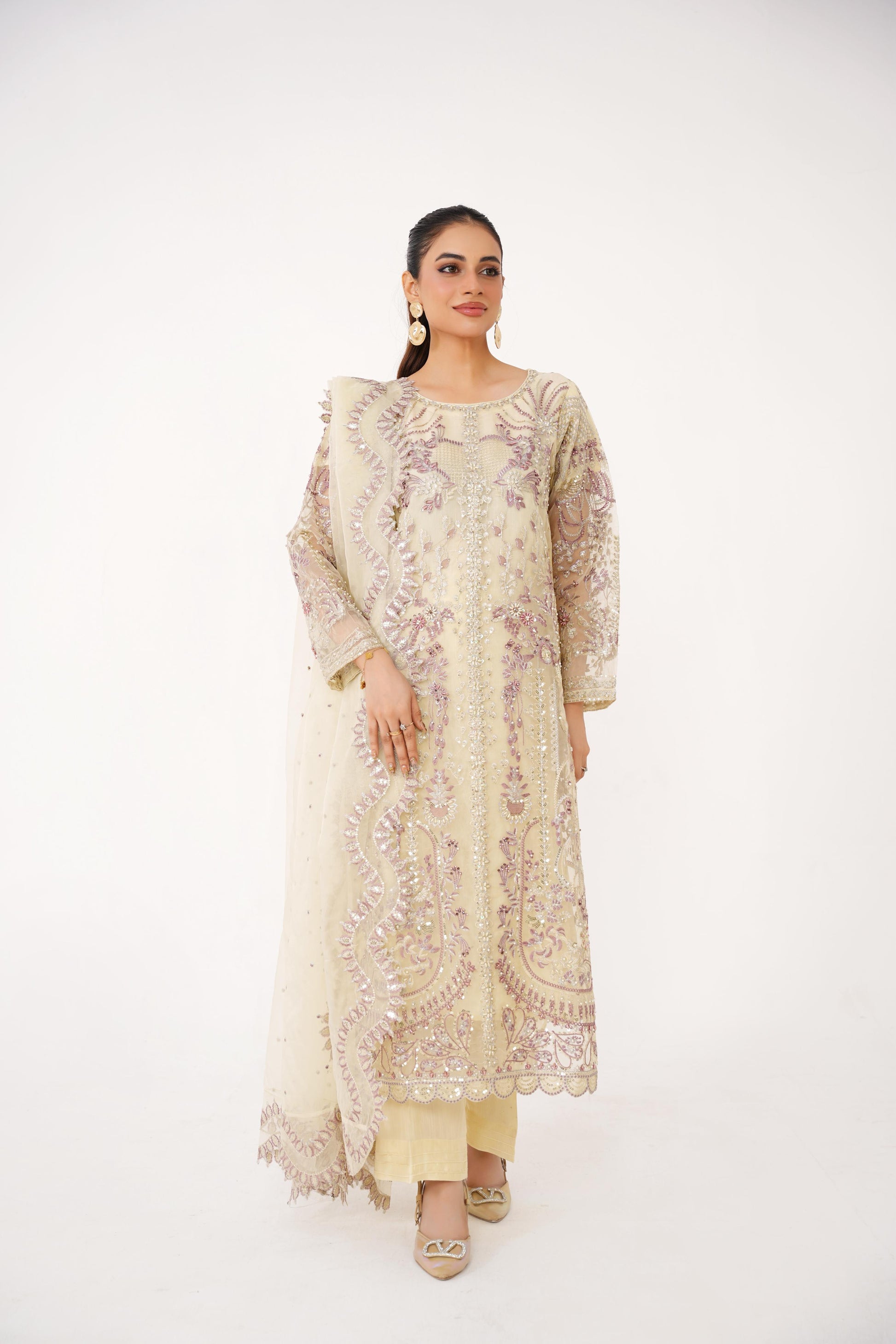 This Champagne Gold Luxury Organza 3-Piece Outfit is a masterpiece of sophistication. With its intricate lavender embroidery and shimmering embellishments, this ensemble radiates timeless charm — making it perfect for festive occasions and winter soirées.