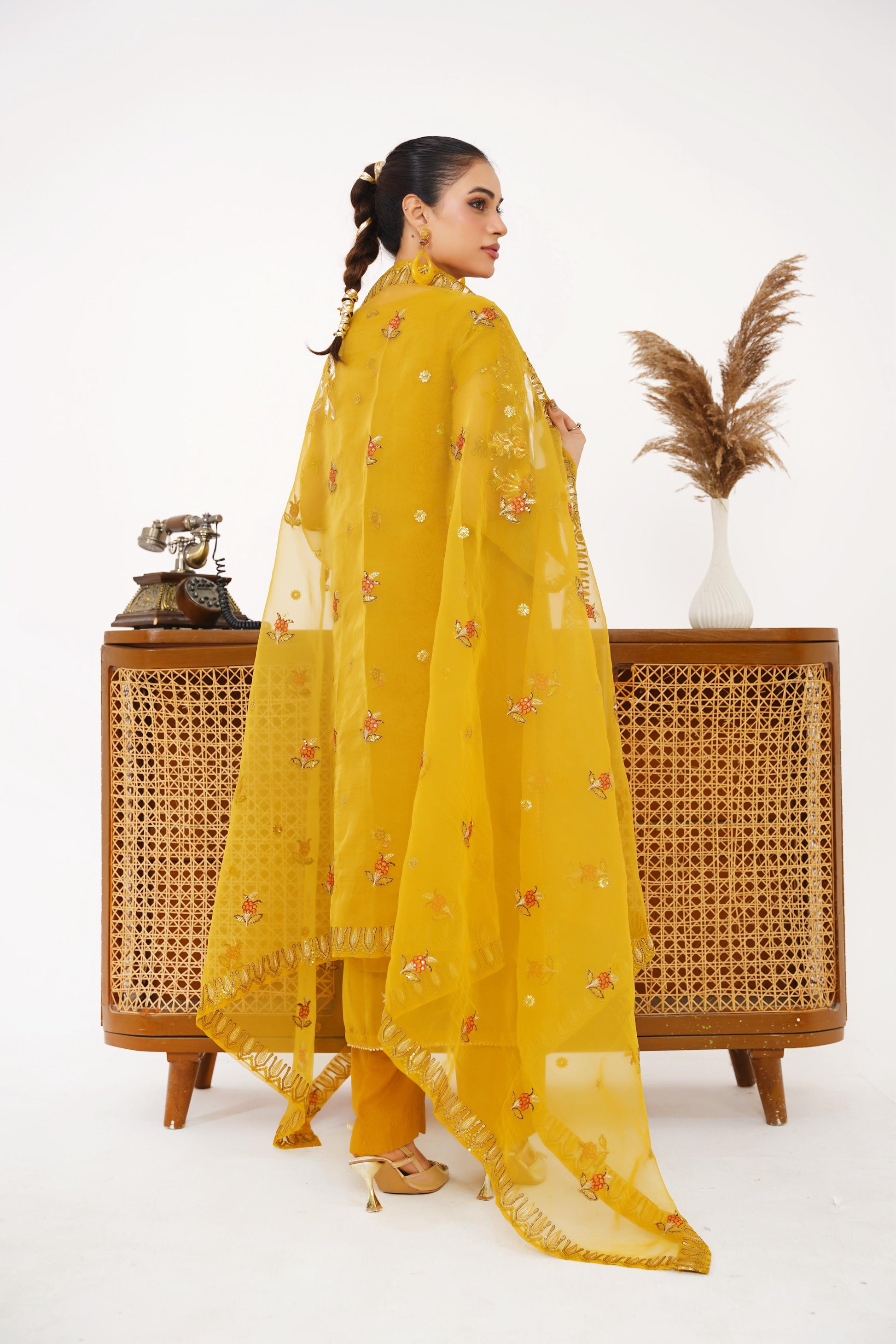 Shirt: Mustard yellow organza with detailed embroidery and embellishments