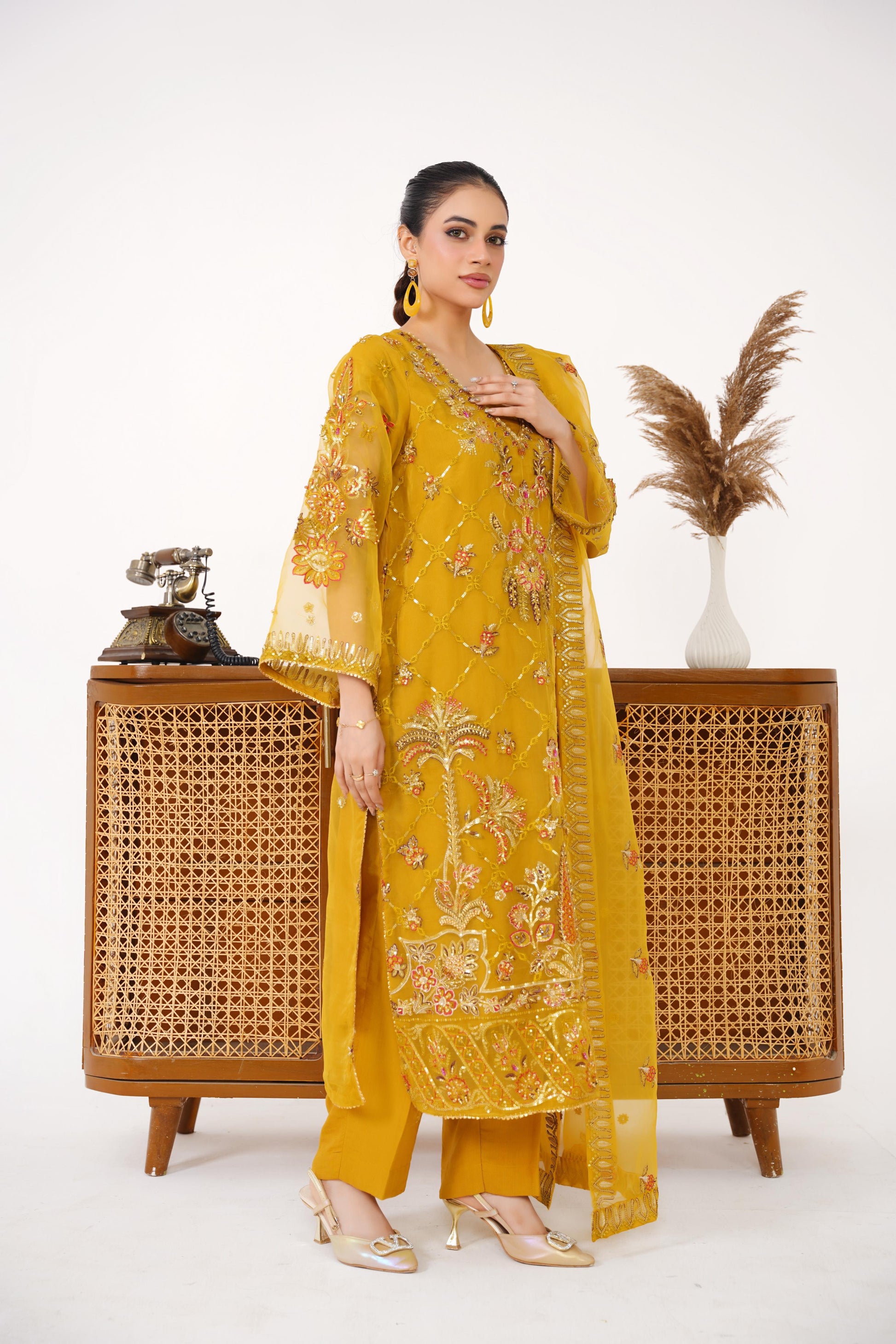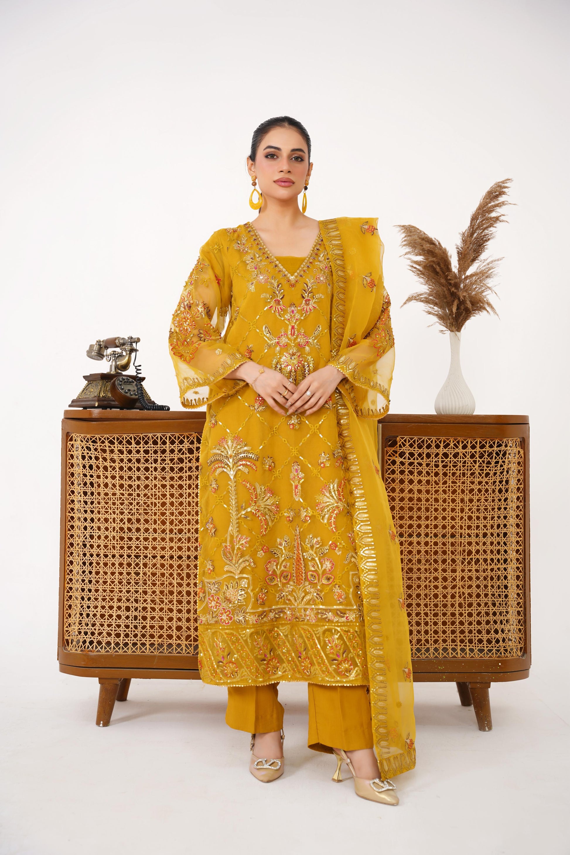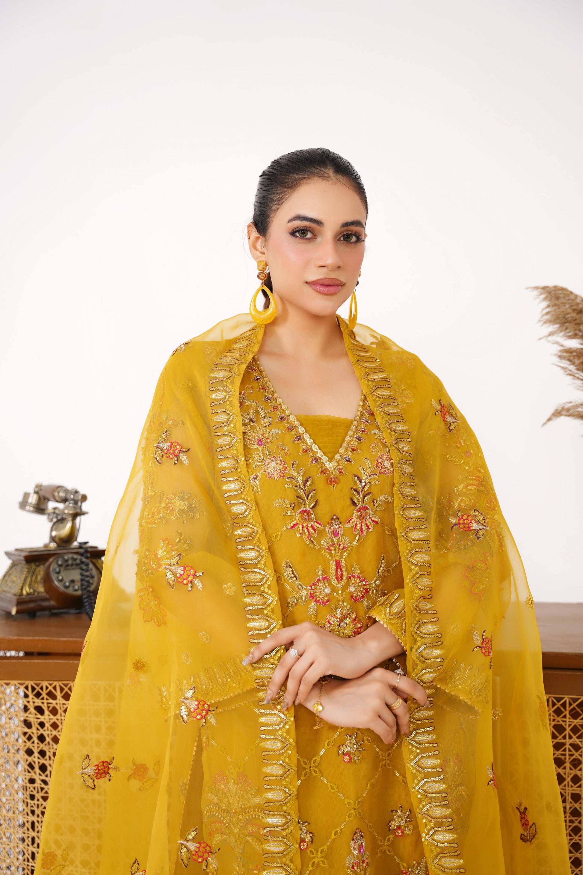 Illuminate your winter festivities with this Mustard Yellow embroidered organza outfit. The bold, warm hue paired with delicate embellishments creates the perfect balance of tradition and modern glamour.