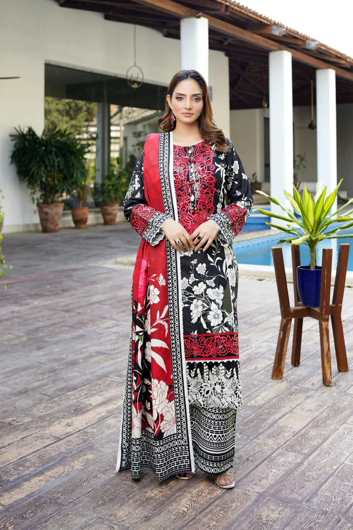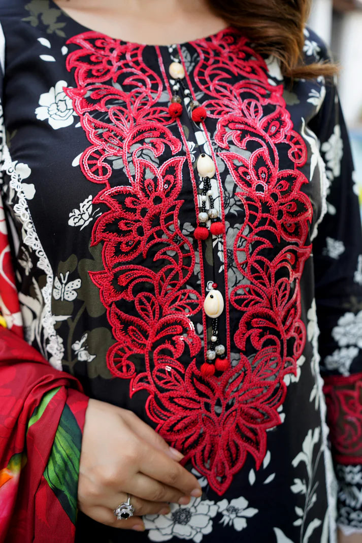 Step into the season with confidence in this Black & Red Printed Lawn 3-Piece Outfit, a perfect blend of traditional charm and modern elegance. The striking black base enhanced with red accents and intricate white floral patterns creates a timeless and eye-catching look.