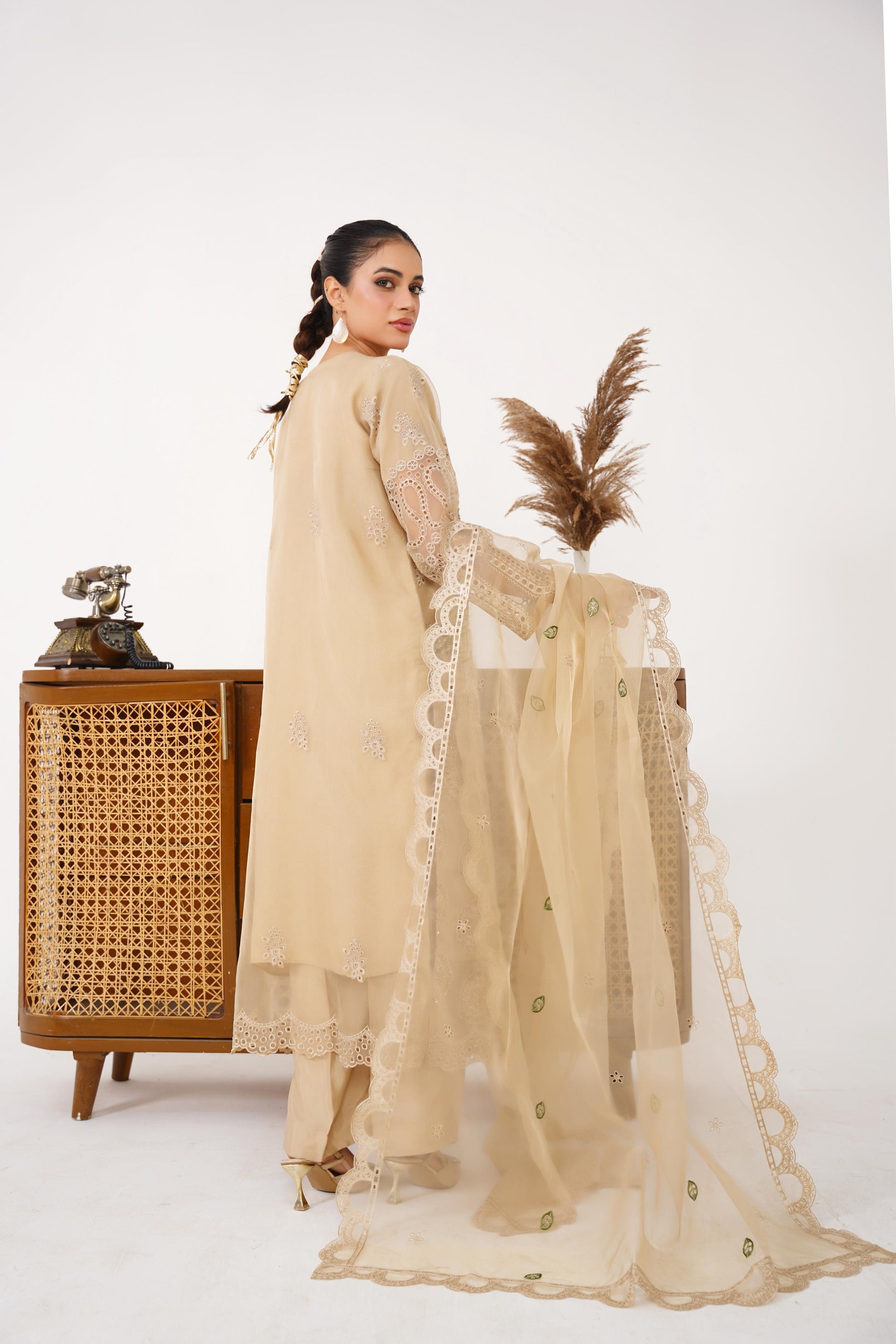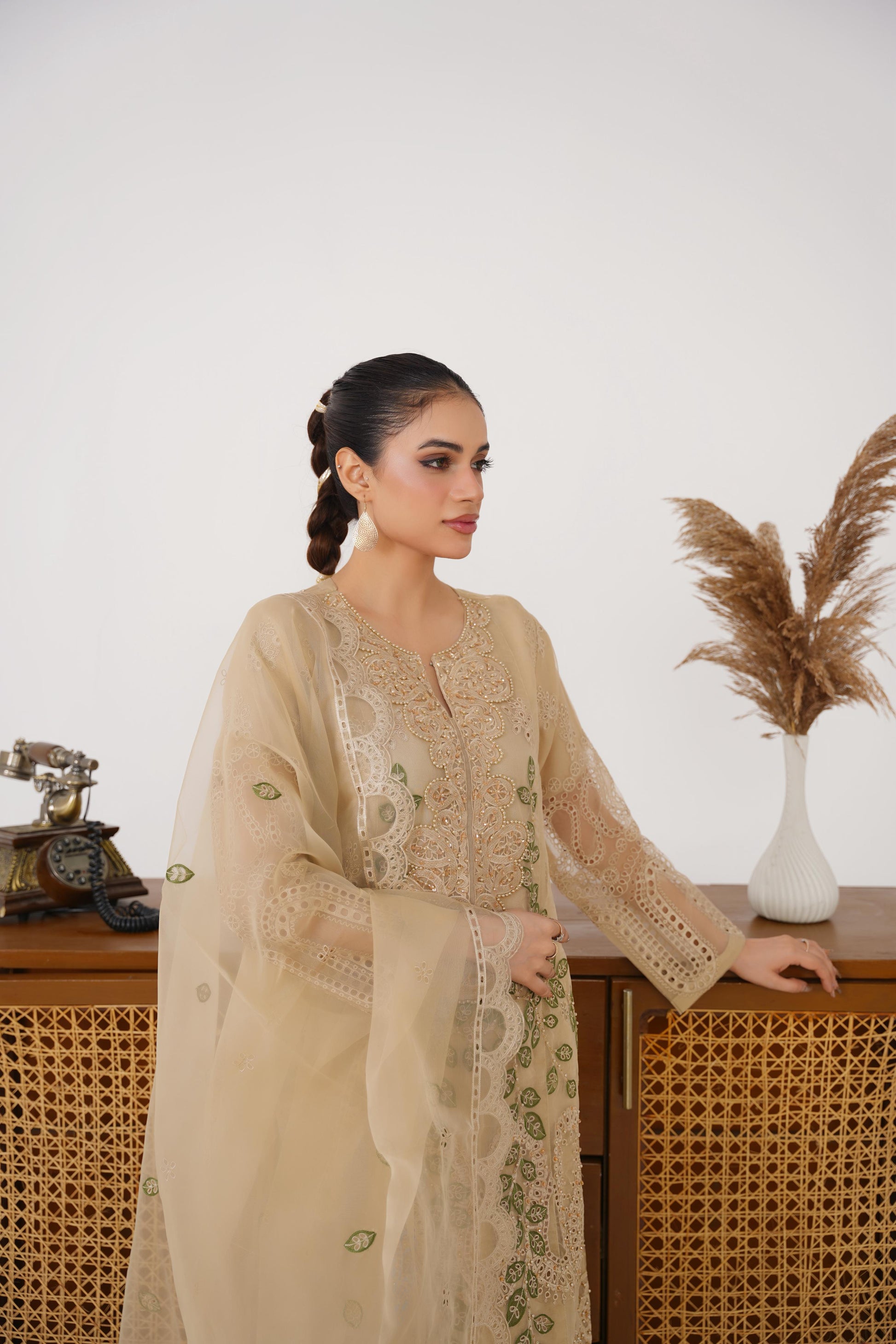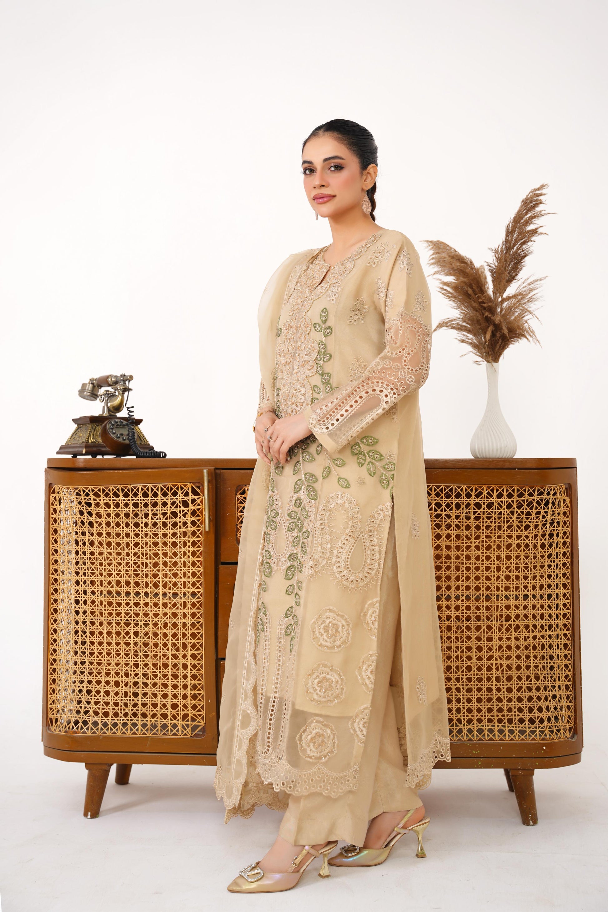 Step into timeless sophistication with this Caramel Beige 3-piece embroidered outfit. The rich warm base is beautifully enhanced with intricate olive green threadwork, creating a perfect fusion of subtle luxury and traditional detailing. Ideal for weddings, festive gatherings, or elegant soirées.