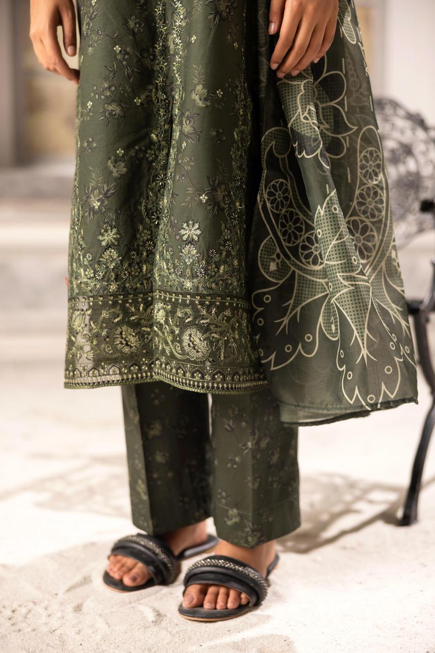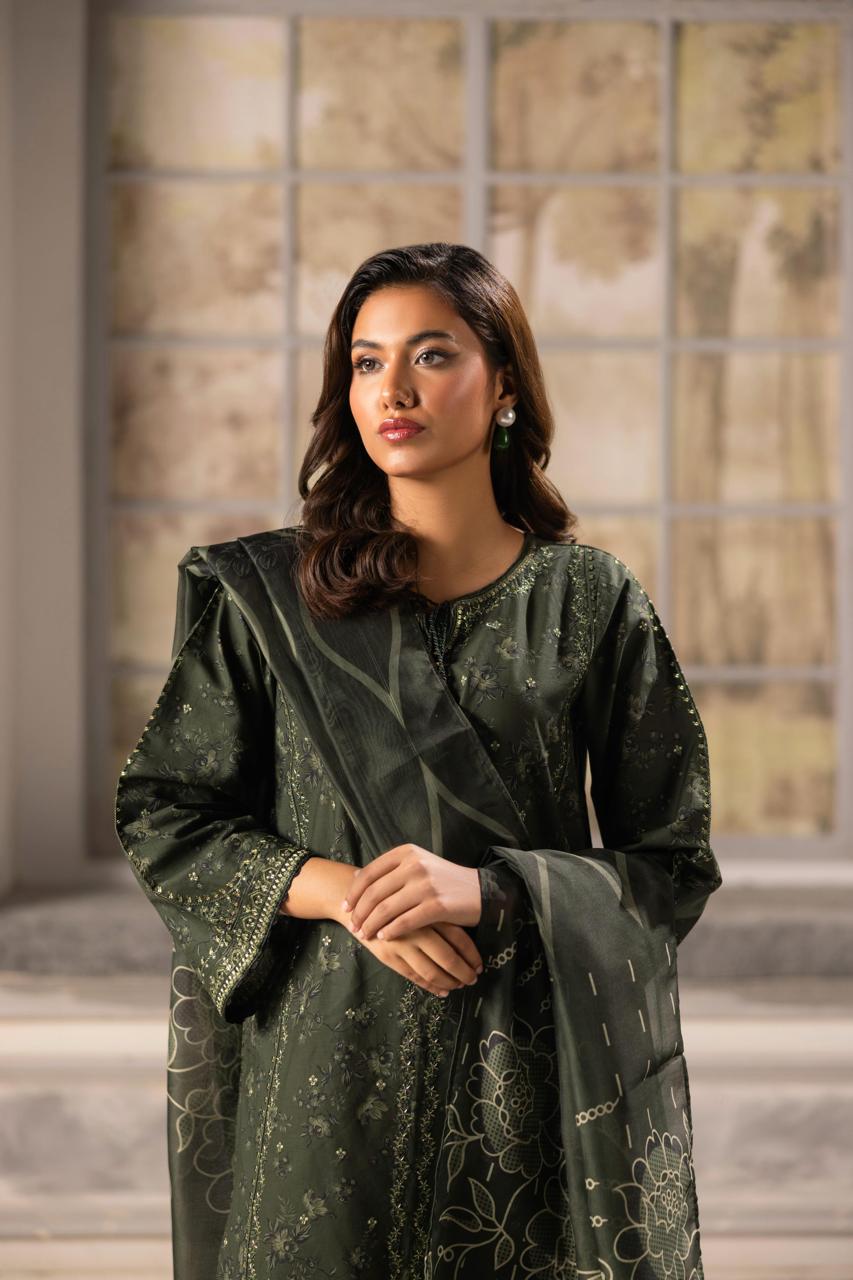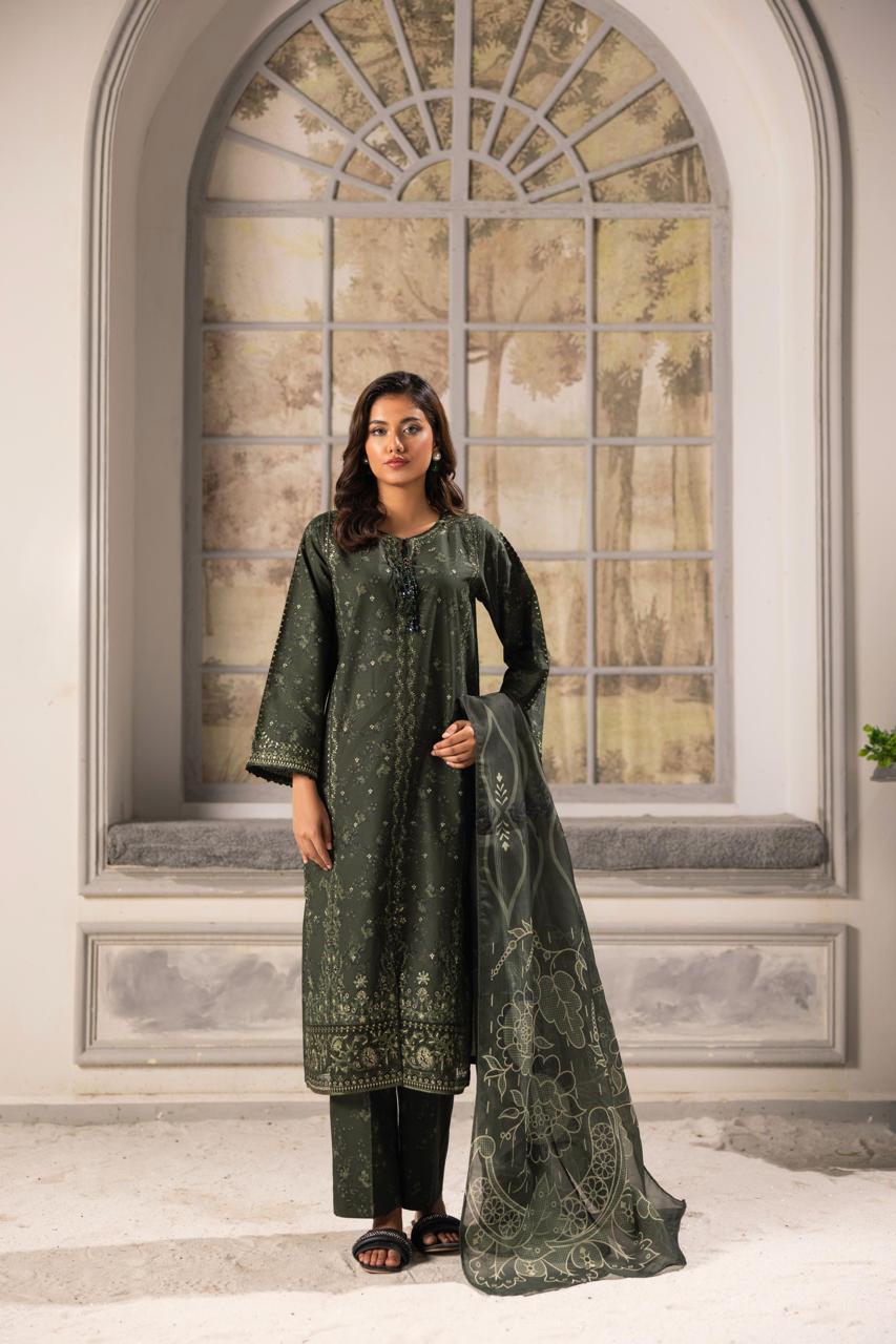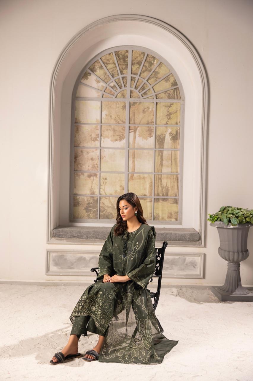 This deep green printed 3-piece suit features elegant detailing on a rich base, creating a bold yet graceful look. Its deep tone and minimal floral print make it a perfect choice for both everyday wear and semi-formal occasions where you want to keep it elegant and sophisticated.