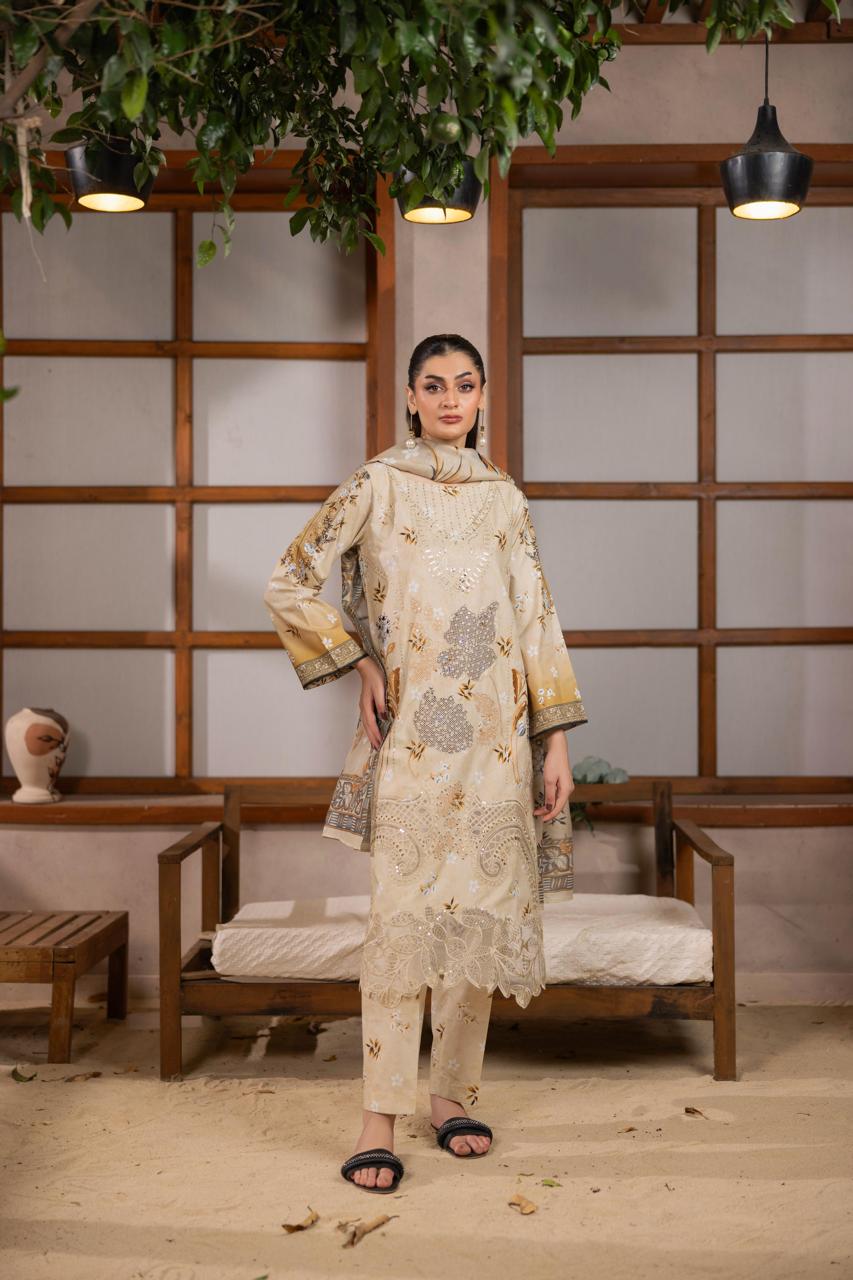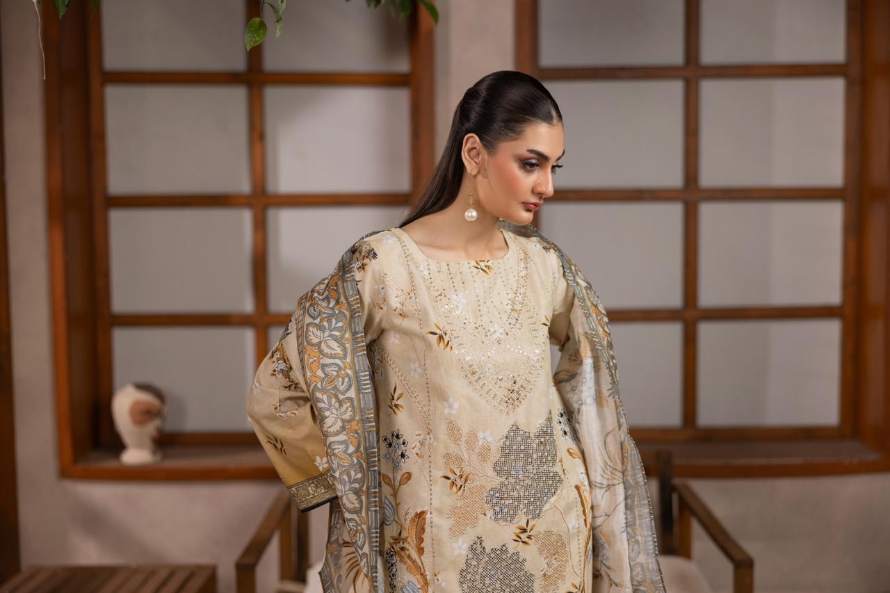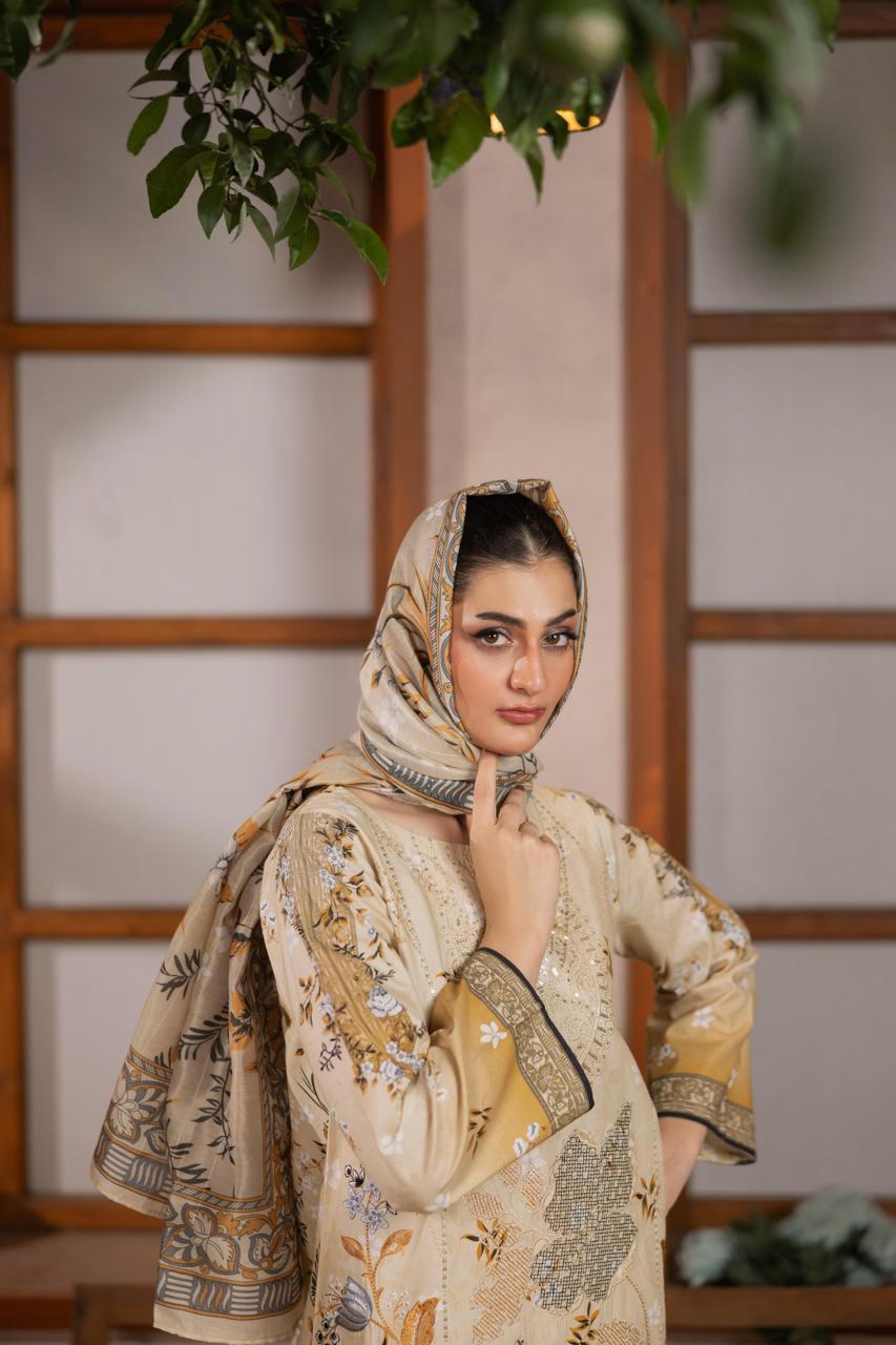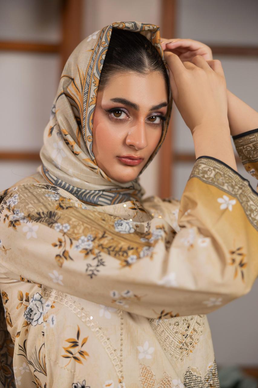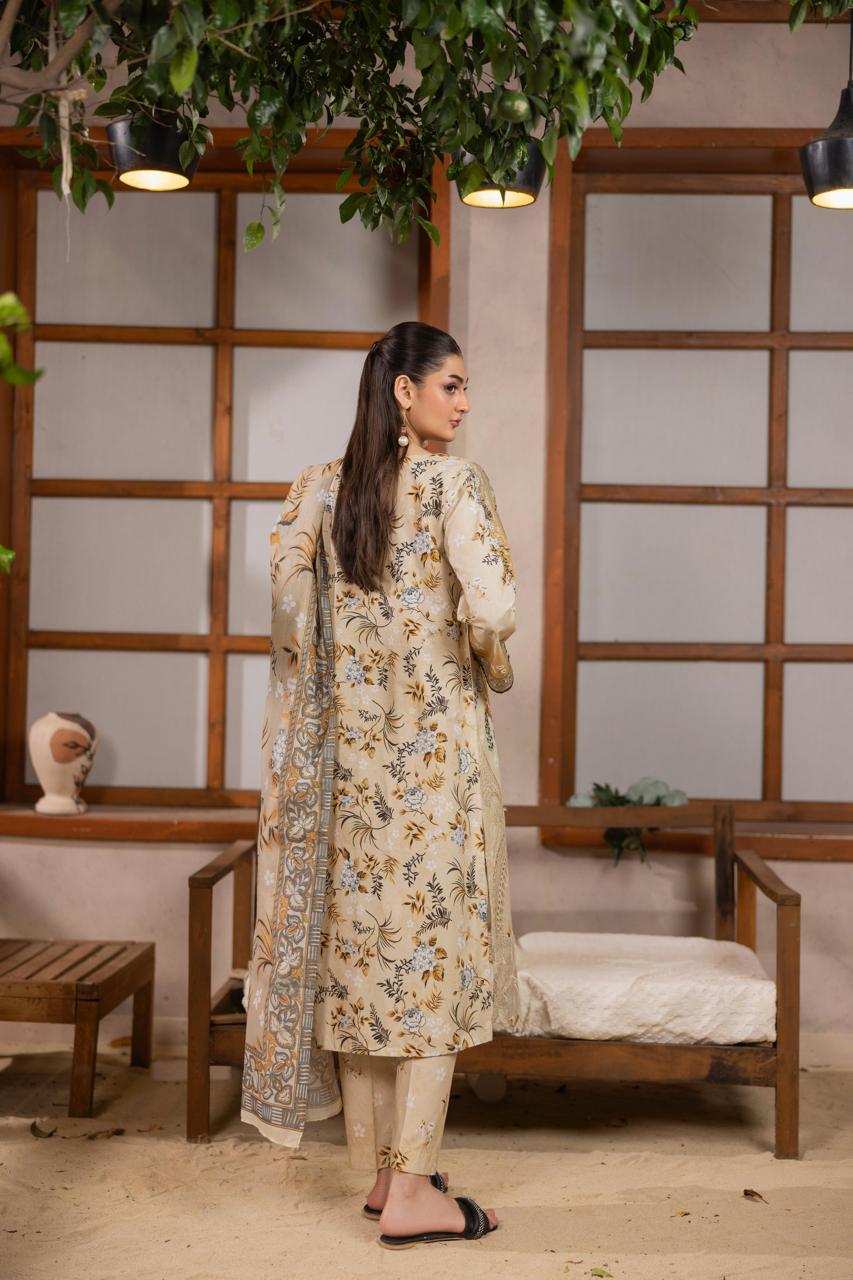 This light cream floral printed 3-piece suit features a soft base with elegant floral patterns in warm, earthy tones. Its light and graceful look makes it perfect for casual wear, daytime gatherings, and semi-formal occasions.