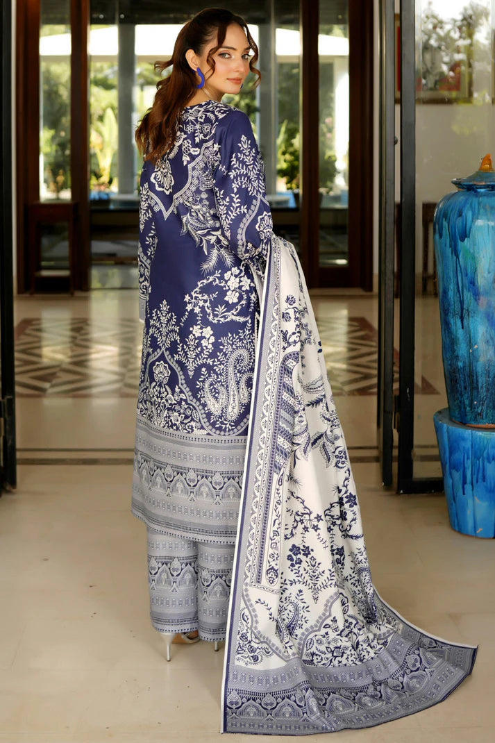 Make a sophisticated statement this season with our Navy Blue & White Printed Lawn 3-Piece Outfit. The classic navy base adorned with intricate white patterns captures a perfect balance between tradition and modern elegance, making it an ideal choice for both daytime events and festive evenings.