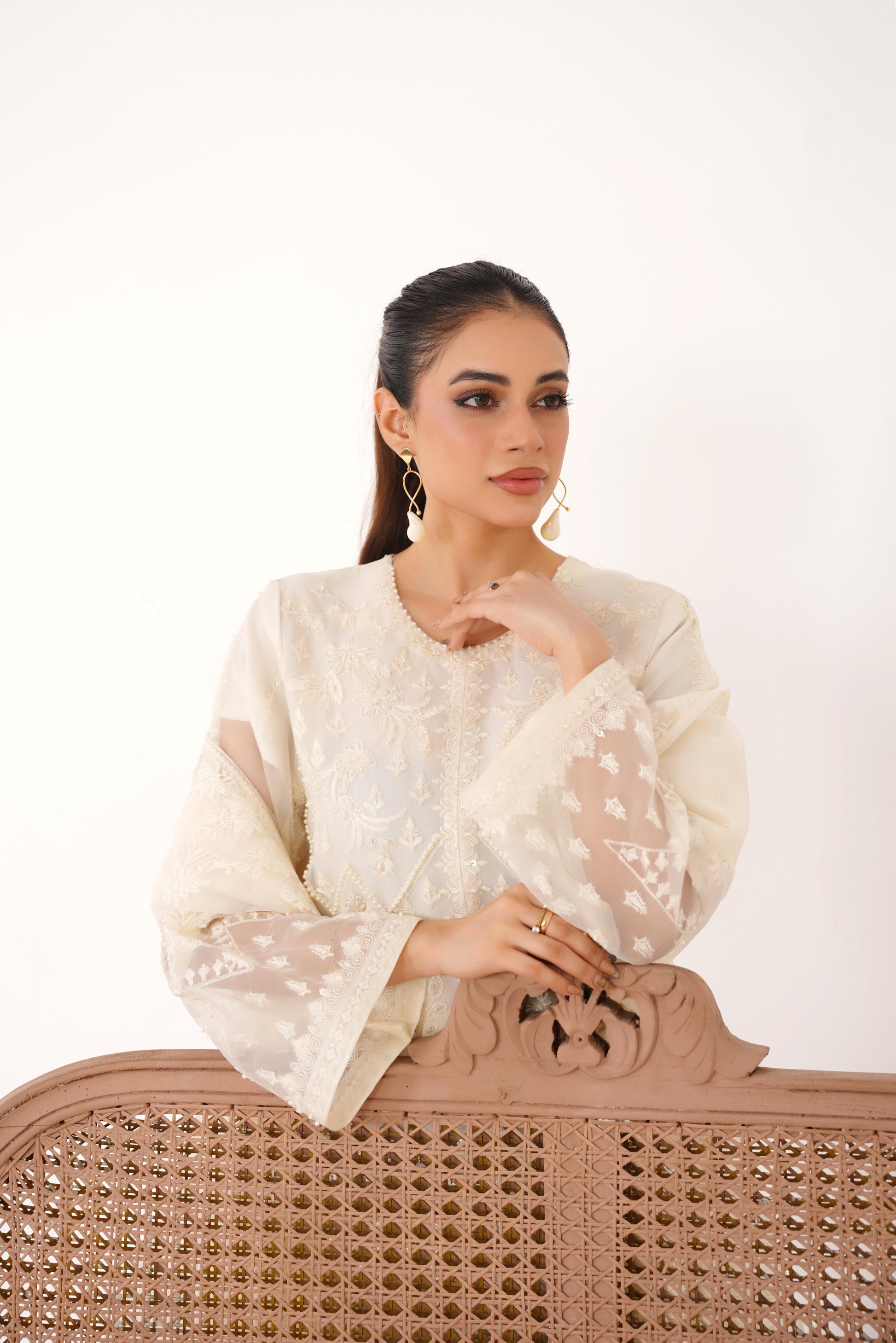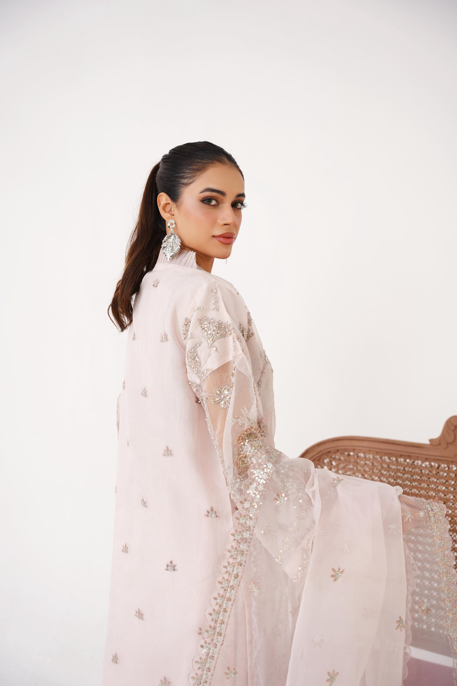 This Off-White Embroidered Organza 3-Piece Outfit is the definition of elegance and grace. The classic off-white shade paired with intricate embroidery gives this piece a refined, graceful appeal perfect for festive occasions and formal gatherings.