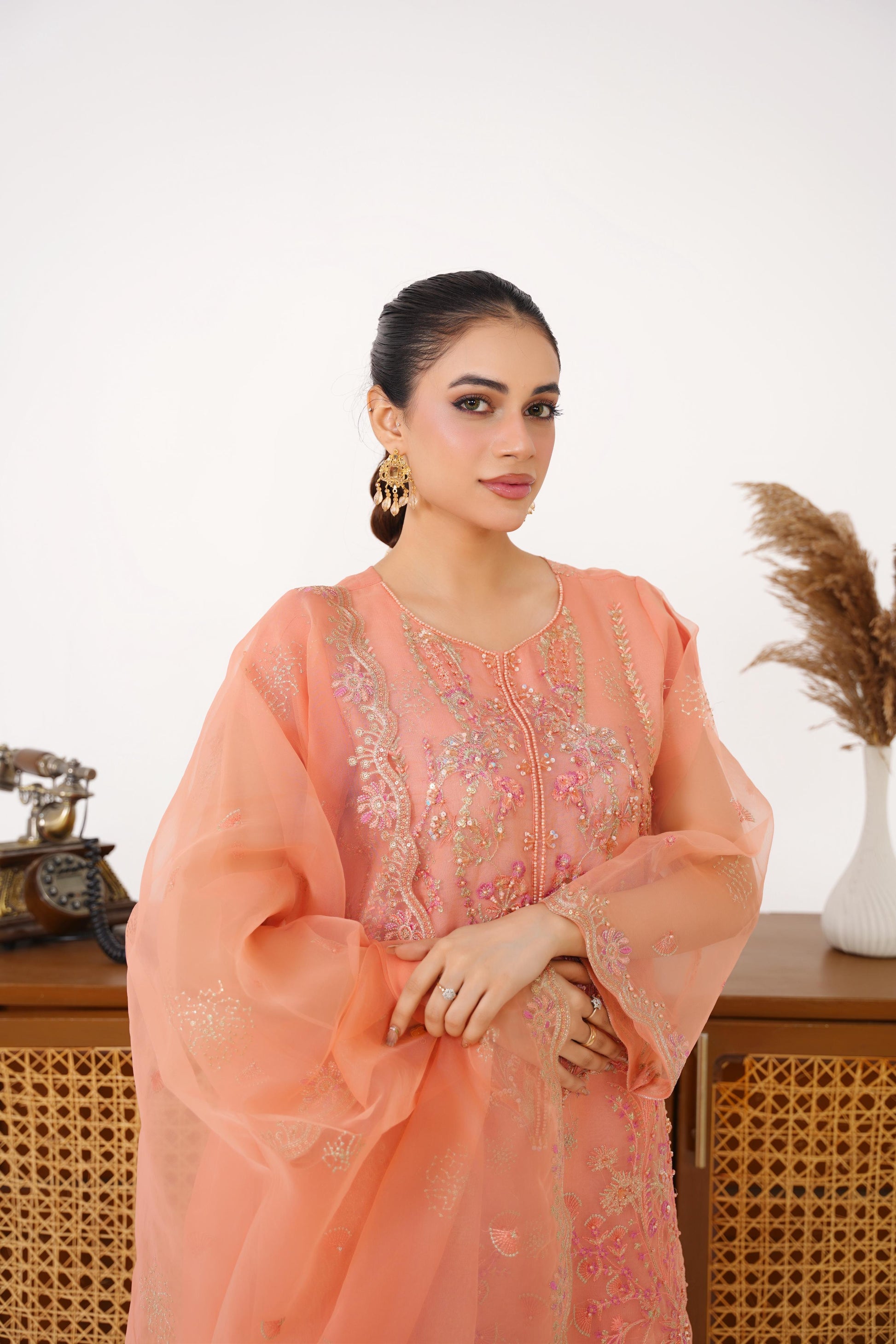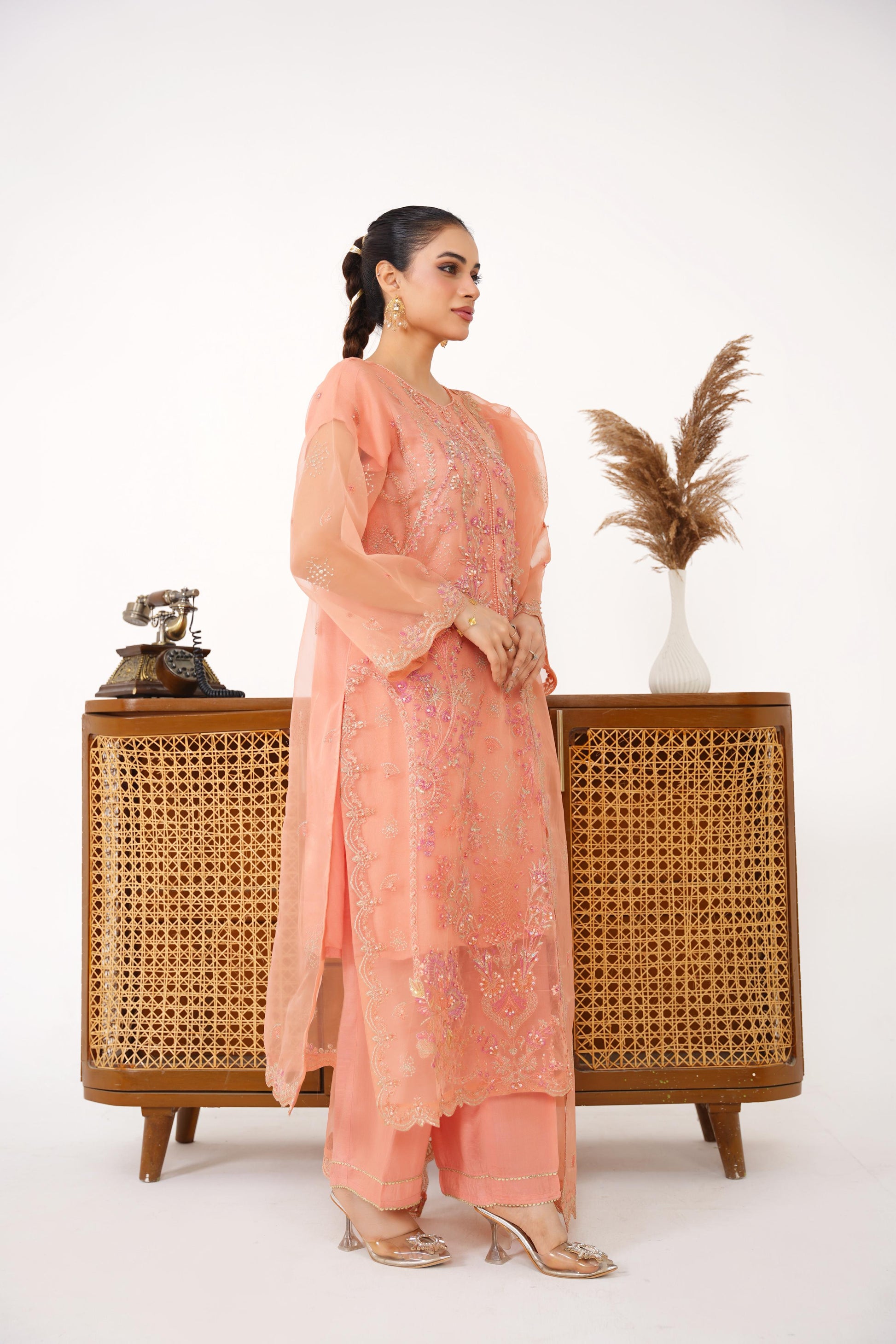 This Peach Embellished Luxury Organza 3-Piece Outfit radiates warmth and grace. The soft peach tone paired with fine embroidery creates a timeless festive look. Ideal for formal occasions, it blends contemporary elegance with traditional craftsmanship.