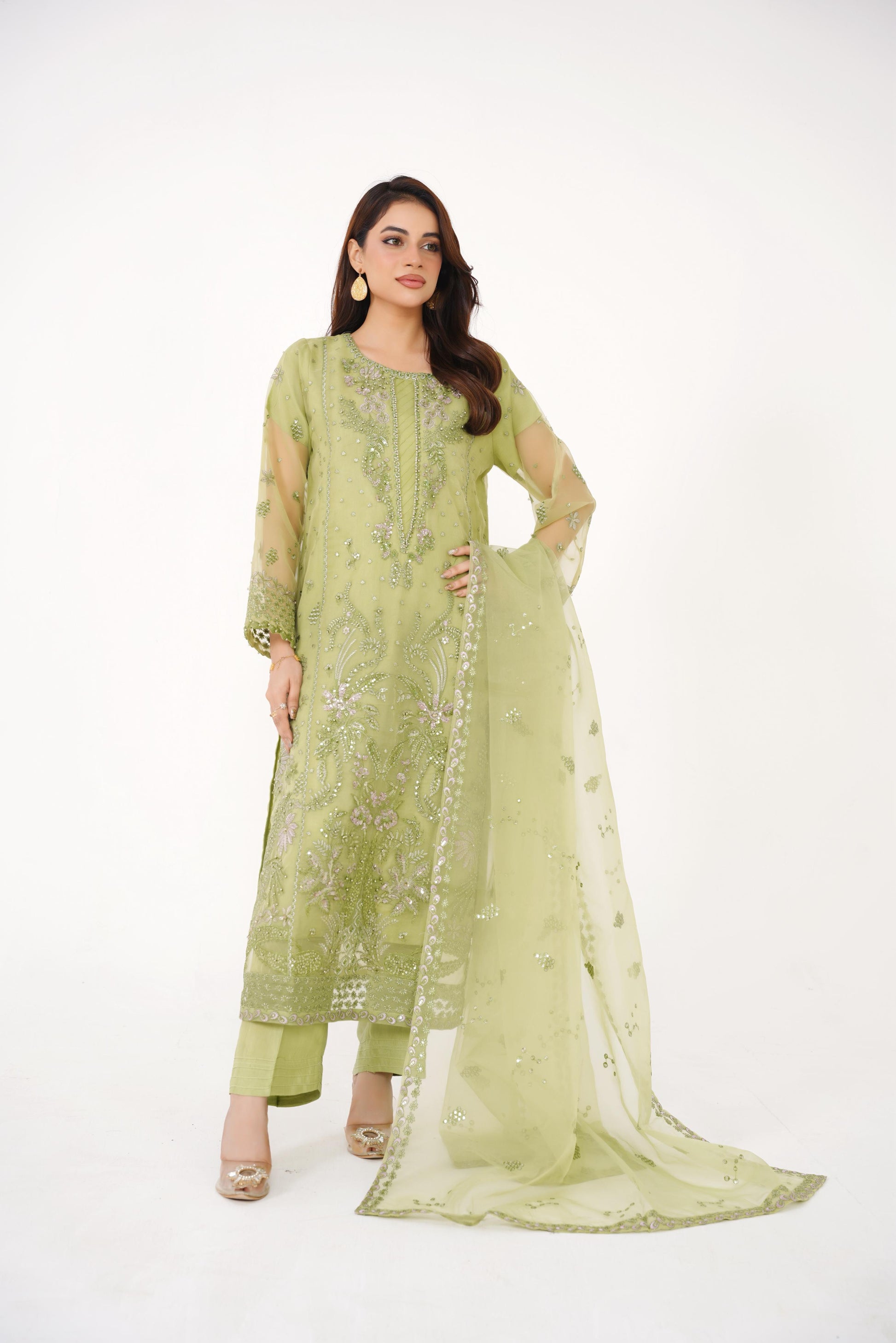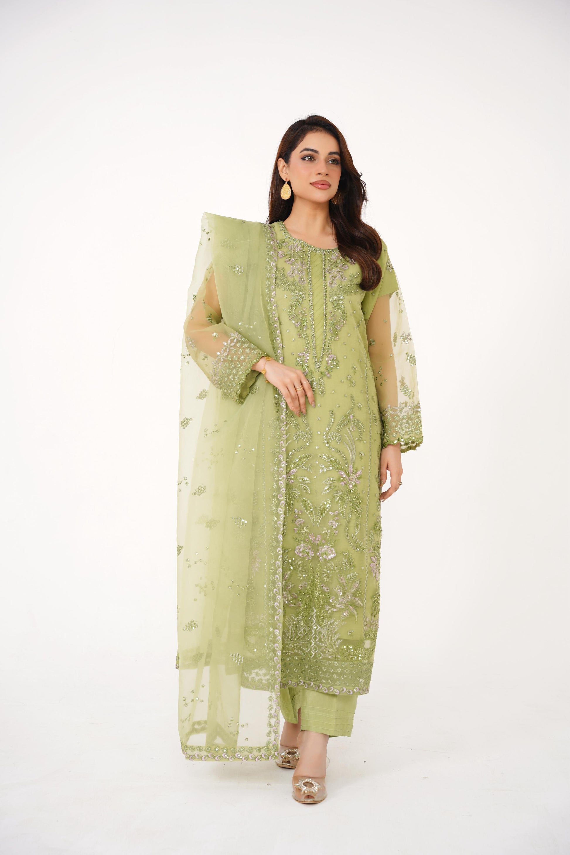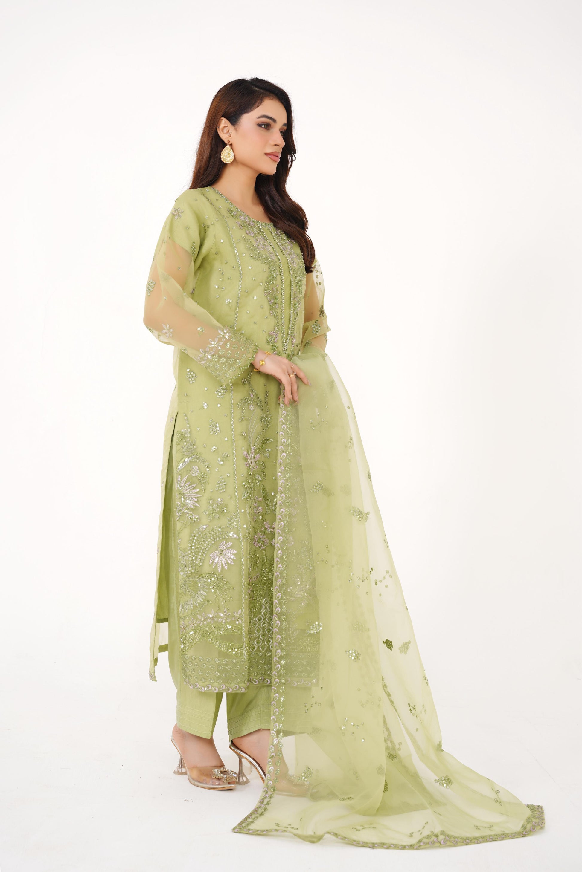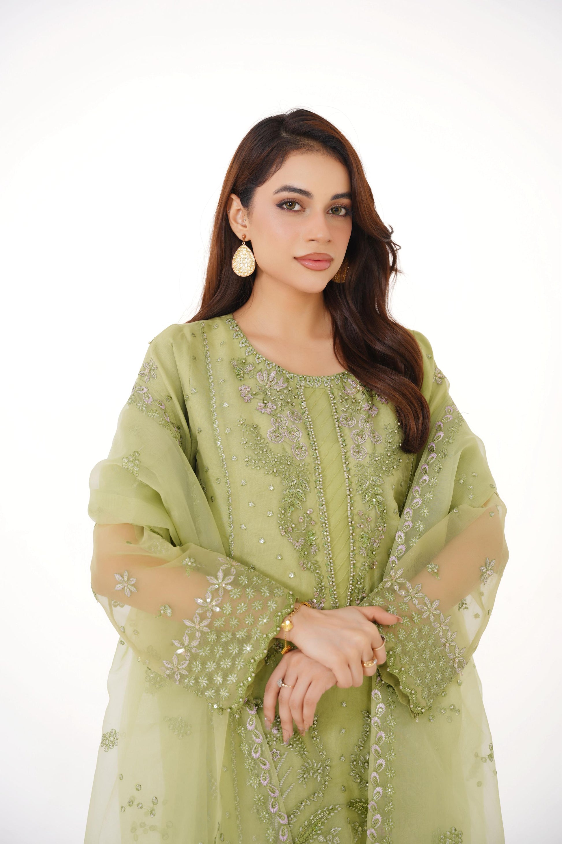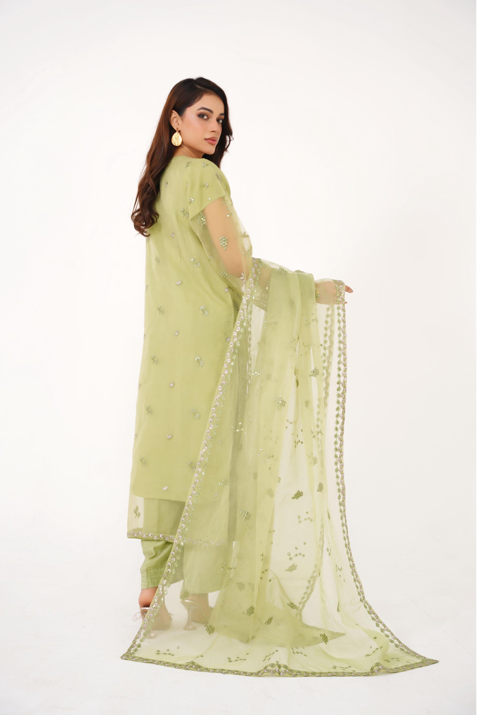 Immerse yourself in the delicate charm of this Pistachio Green embroidered outfit, designed to exude understated elegance. The refreshing hue, combined with intricate silver threadwork and delicate embellishments, makes it a standout choice for festive and semi-formal occasions.