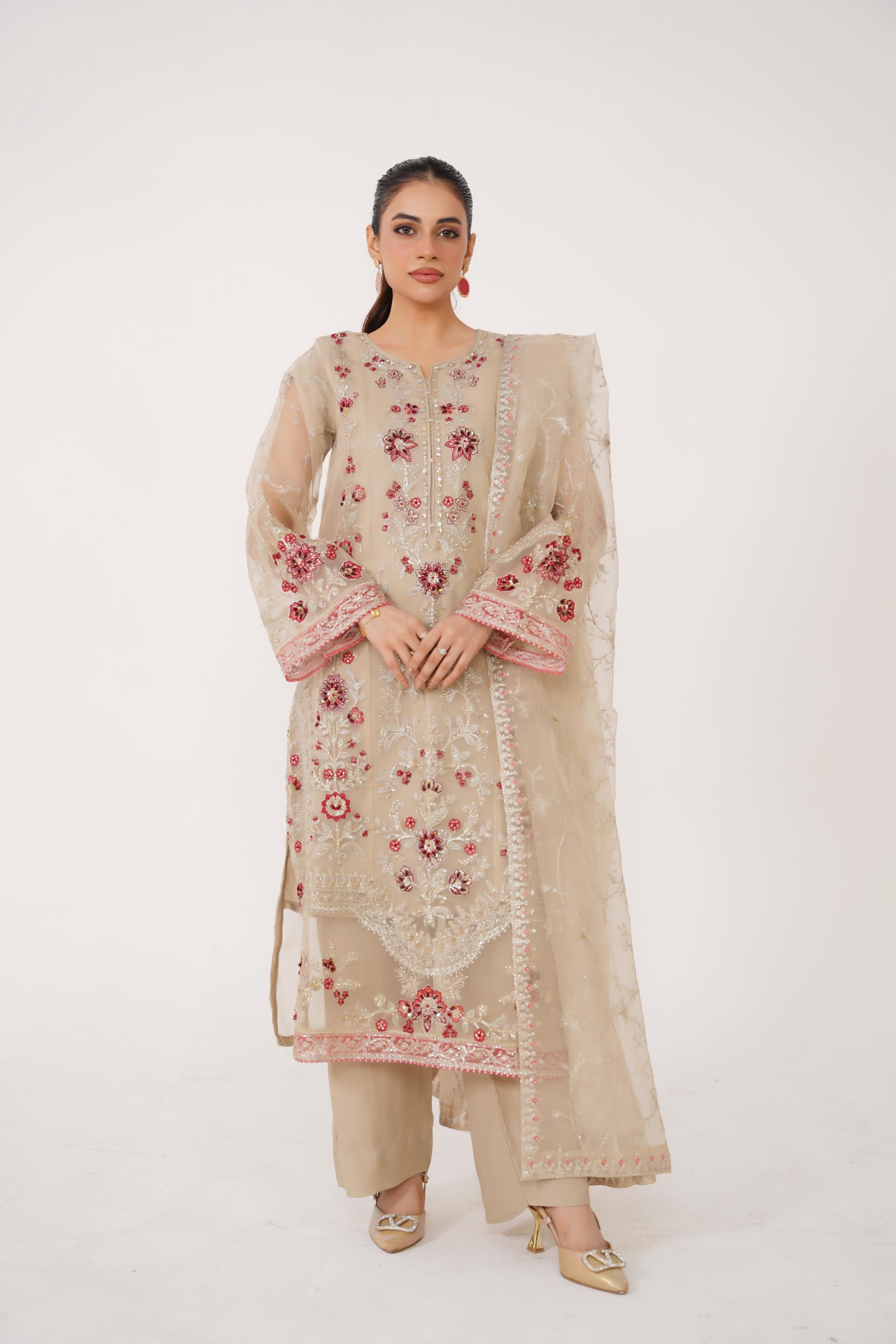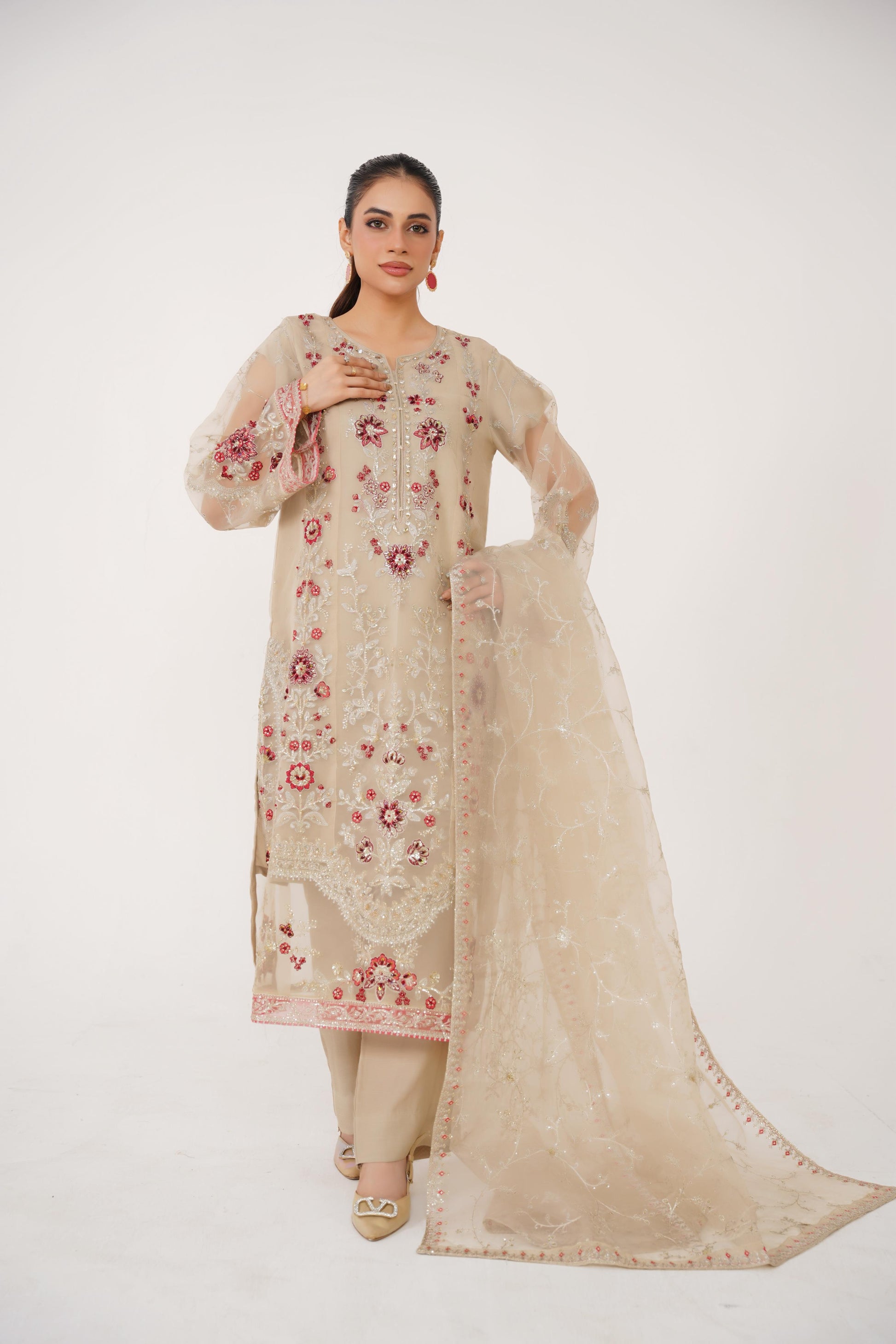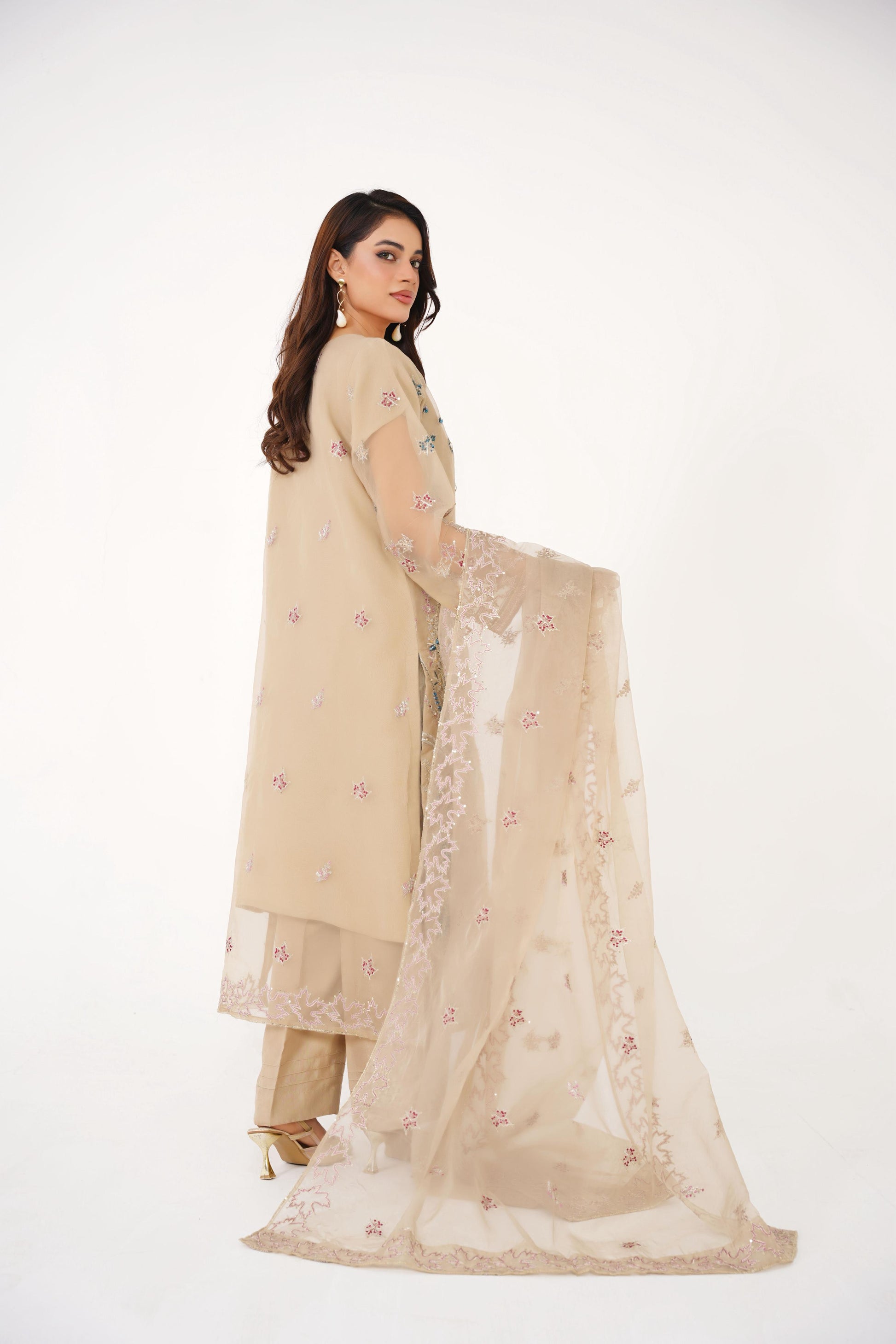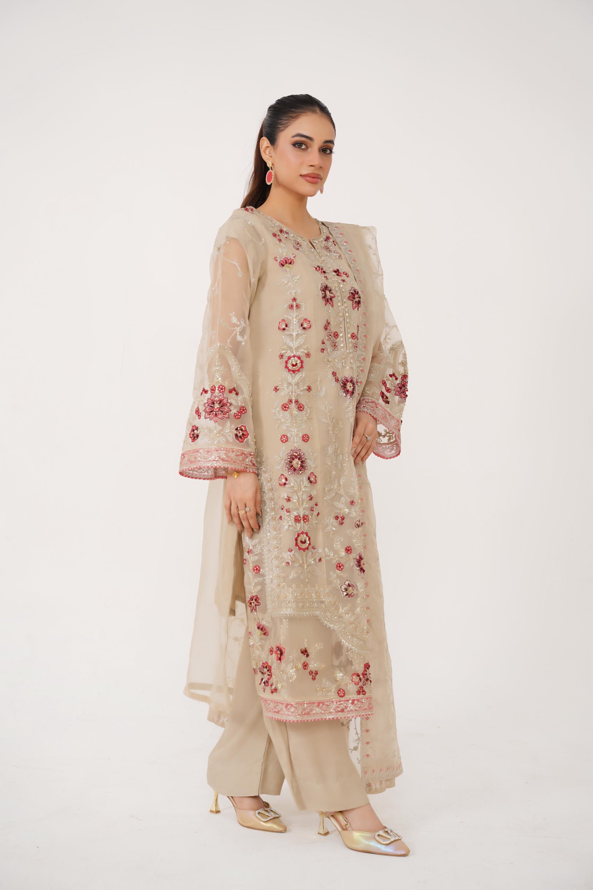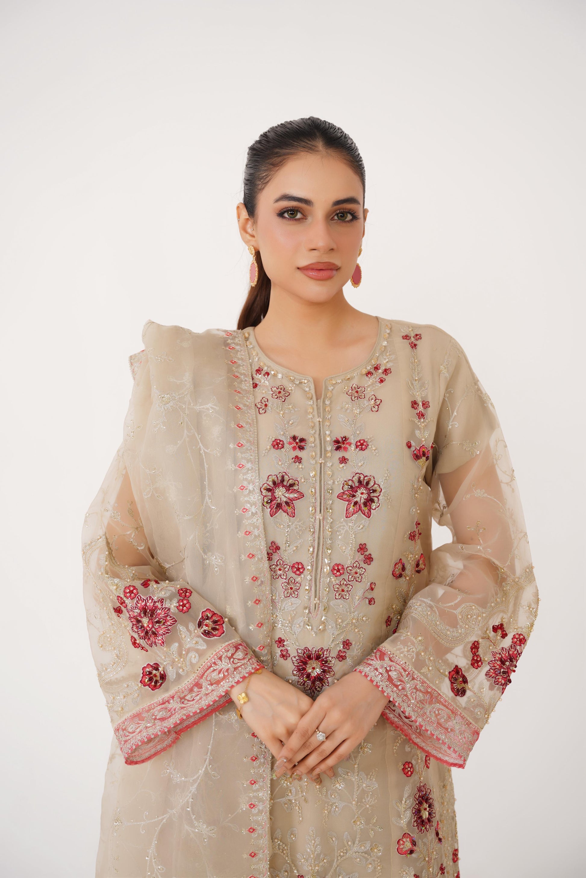 Exude effortless elegance with this Soft Beige Luxury Organza Outfit, a graceful ensemble that beautifully blends minimalism with delicate handcrafted detailing. The soft neutral tone makes it a versatile pick for both daytime and evening occasions.